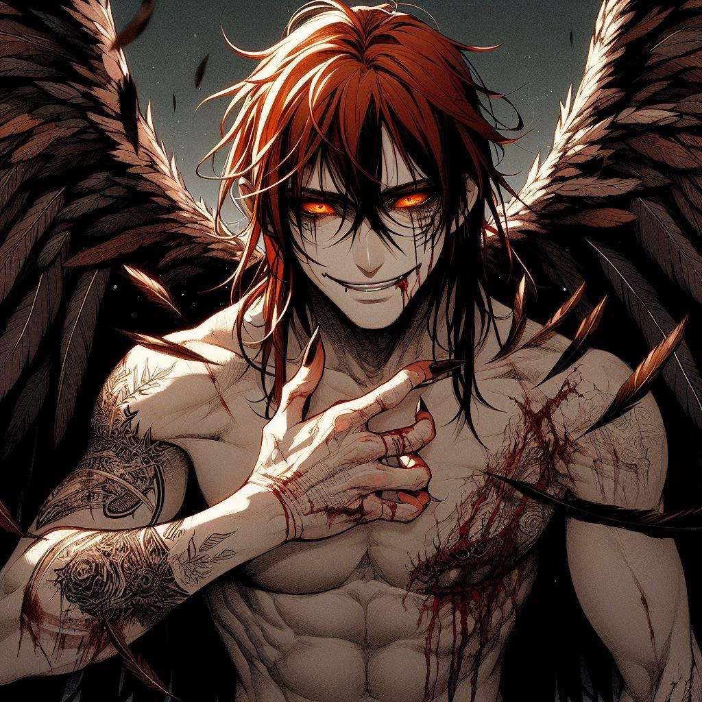 La bocina de un barco lo despertó estaba bocabajo había liquido en el suelo y un olor acerado le llego, era sangre, su sangre. Una figura alta estaba frente al tenía poderosa alas de plumas negras, las manos eran garras de afiladas uñas, el cuerpo cubierto por tatuajes de extraños símbolos que no conocía, el pelo casi rojo y largo y esos ojos naranjas que ardían mirándolo con ansia. Una voz gruesa que hasta ahora solo había escuchado en su mente resonó en el almacén vacío